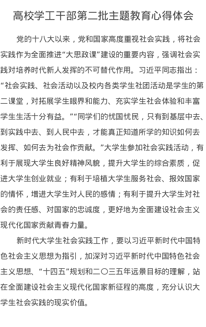 高校学工干部第二批主题教育心得体会(特色社会主义思想)
