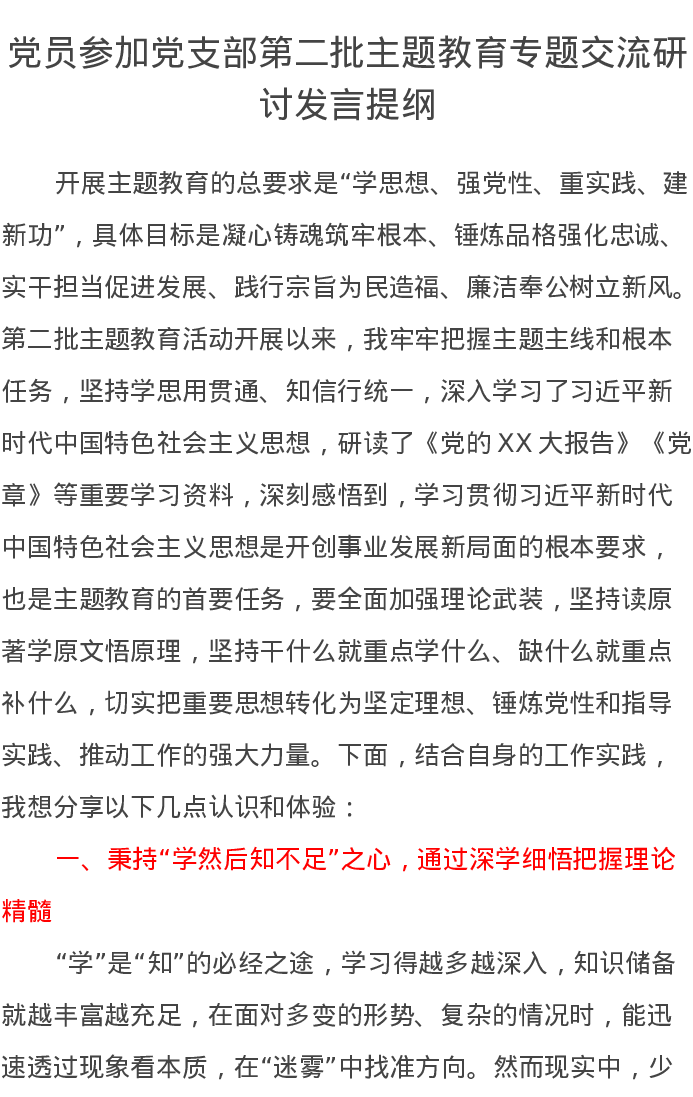 党员参加党支部第二批主题教育专题交流研讨发言提纲(特色社会主义思想)