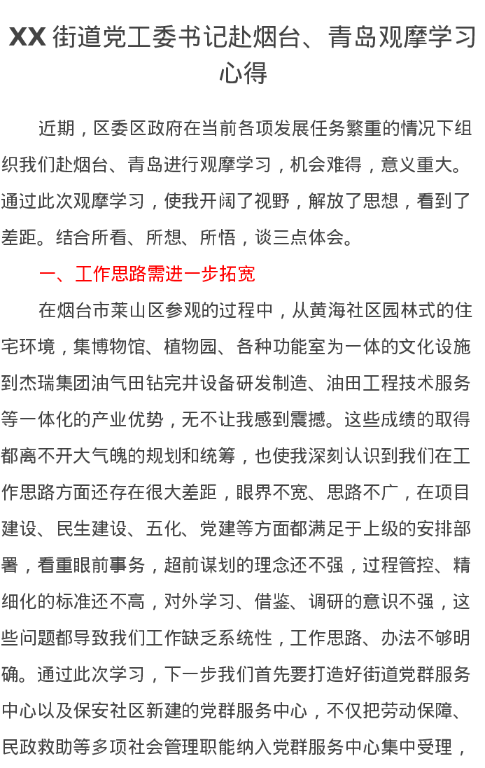 XX街道党工委书记赴烟台、青岛观摩学习心得