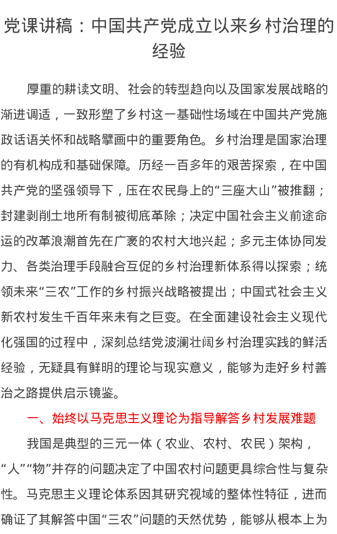 党课讲稿:中国共产党成立以来乡村治理的经验
