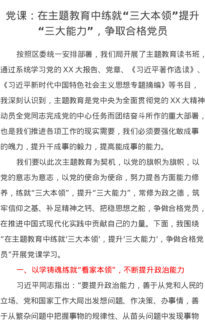 党课讲稿:在主题教育中练就“三大本领”提升“三大能力”,争取合格党员(特色社会主义思想)