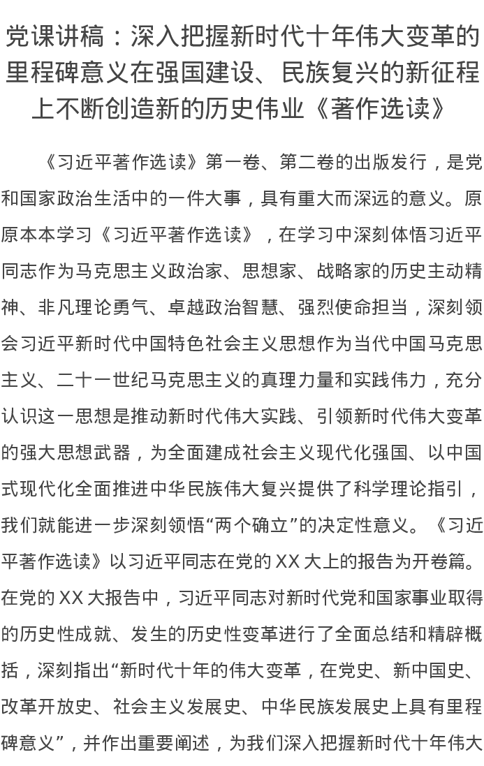 党课讲稿:深入把握新时代十年伟大变革的里程碑意义在强国建设、民族复兴的新征程上不断创造新的历史伟业《著作选读》