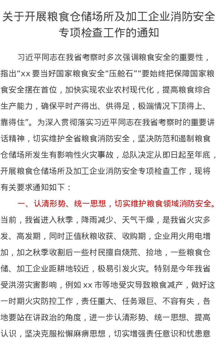 关于开展粮食仓储场所及加工企业消防安全专项检查工作的通知