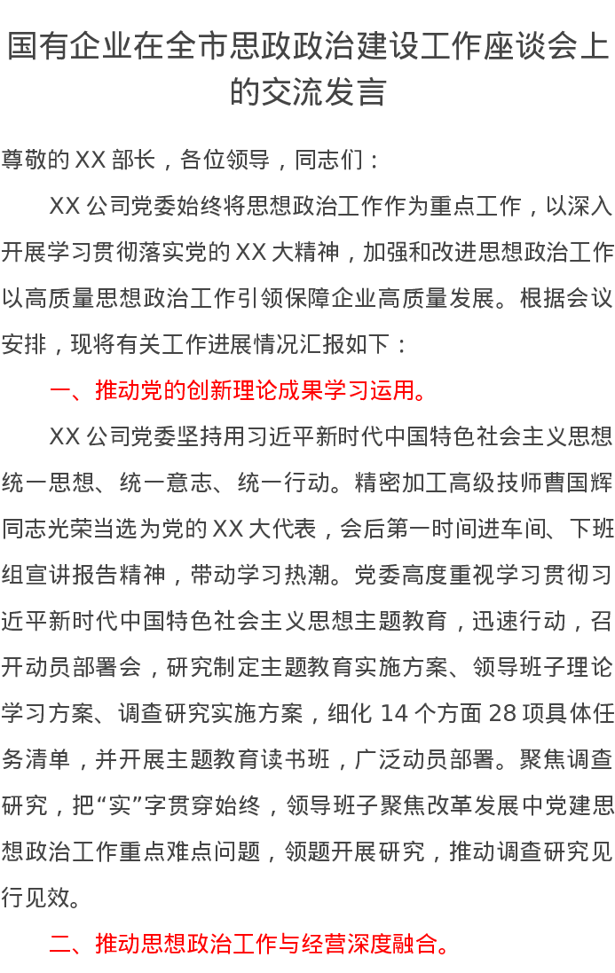 国有企业在全市思政政治建设工作座谈会上的交流发言