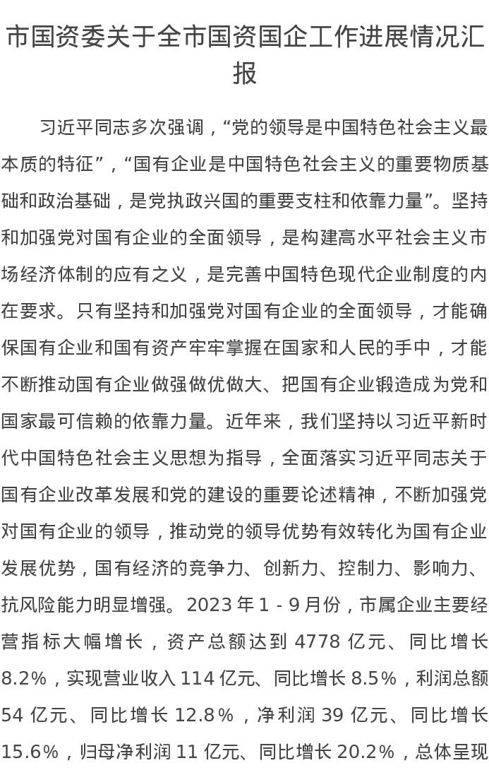 市国资委关于全市国资国企工作进展情况汇报