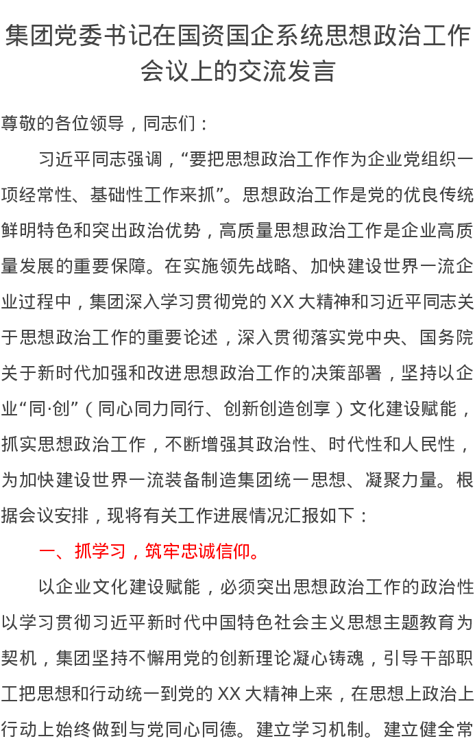 集团党委书记在国资国企系统思想政治工作会议上的交流发言