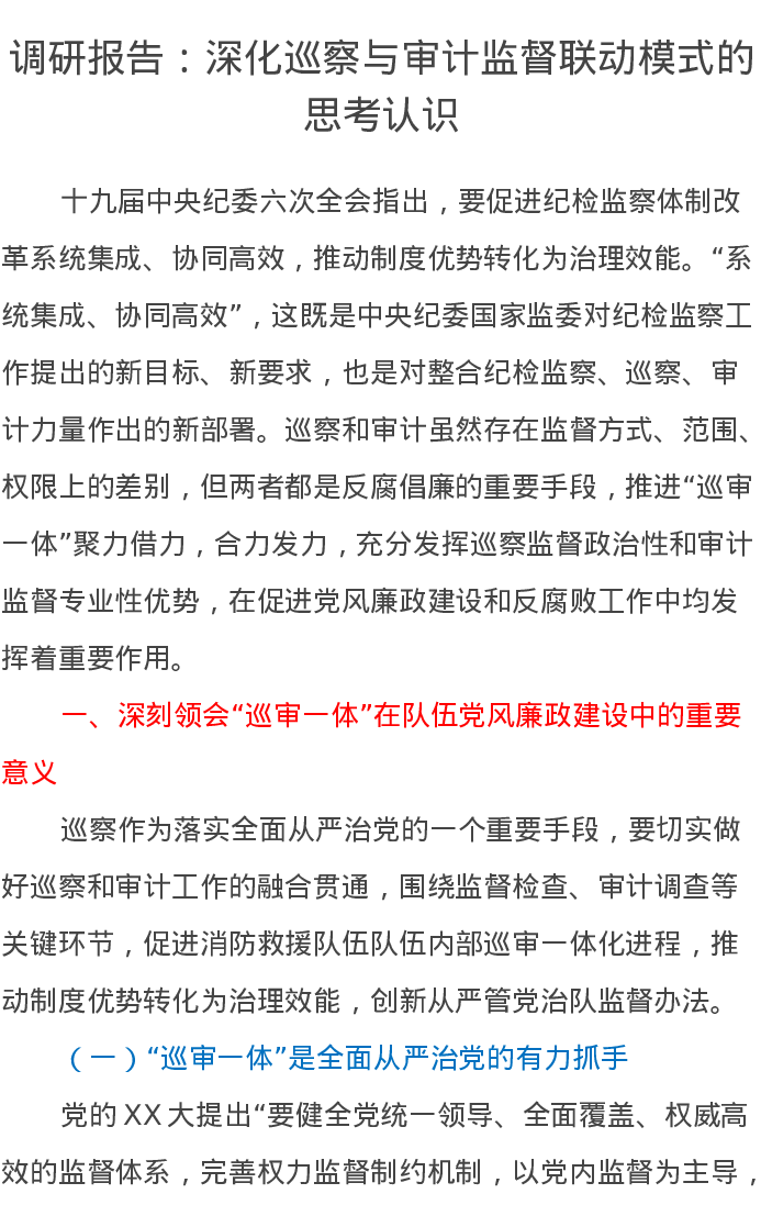 调研报告:深化巡察与审计监督联动模式的思考认识