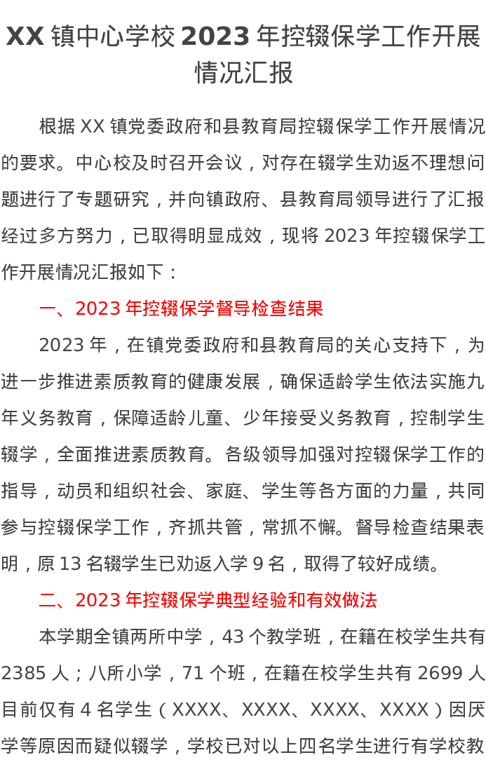 XX镇中心学校2023年控辍保学工作开展情况汇报