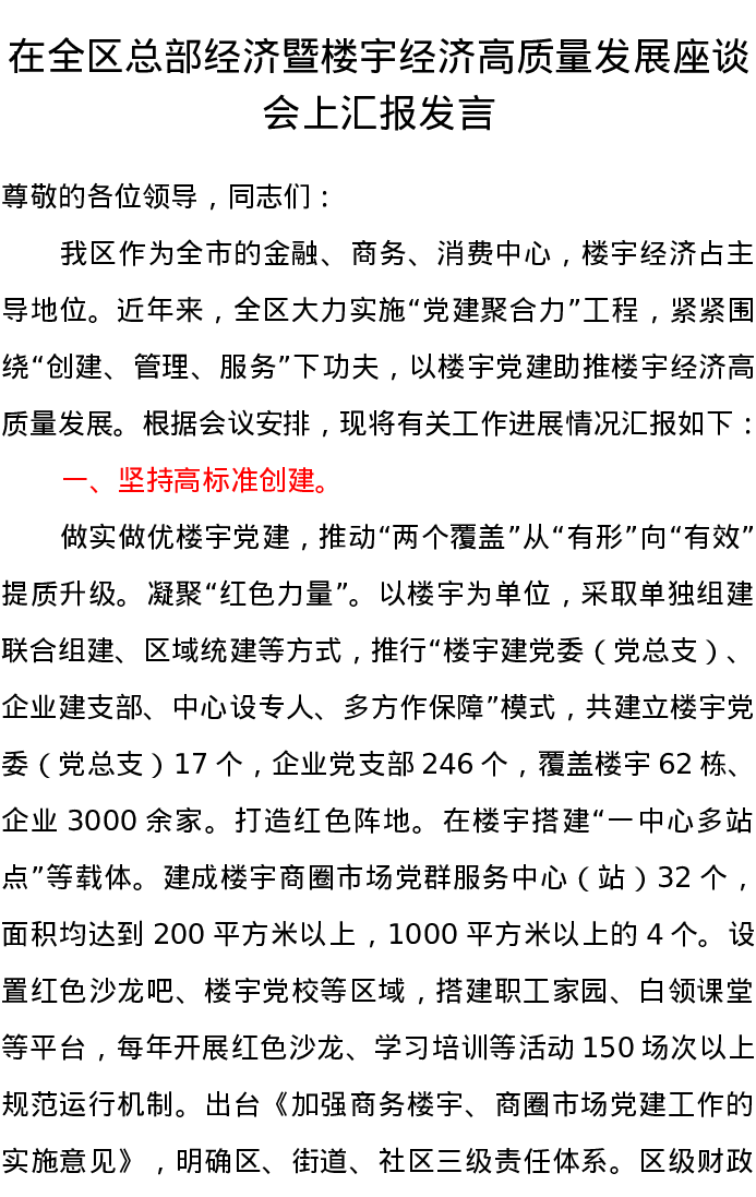 在全区总部经济暨楼宇经济高质量发展座谈会上汇报发言