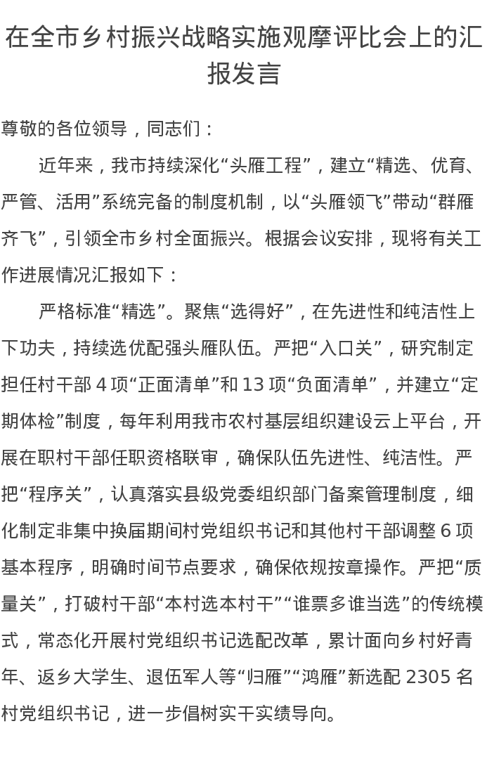 在全市乡村振兴战略实施观摩评比会上的汇报发言