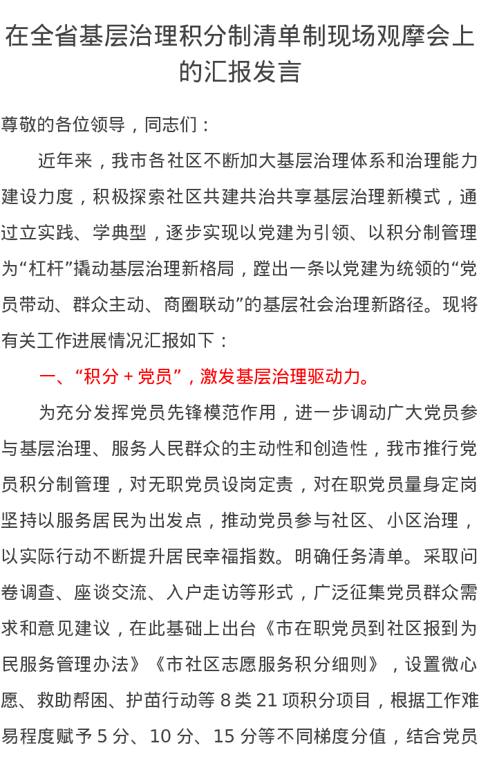 在全省基层治理积分制清单制现场观摩会上的汇报发言
