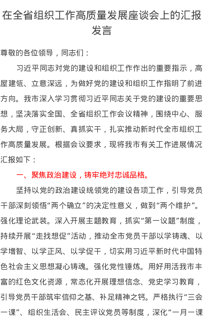 在全省组织工作高质量发展座谈会上的汇报发言