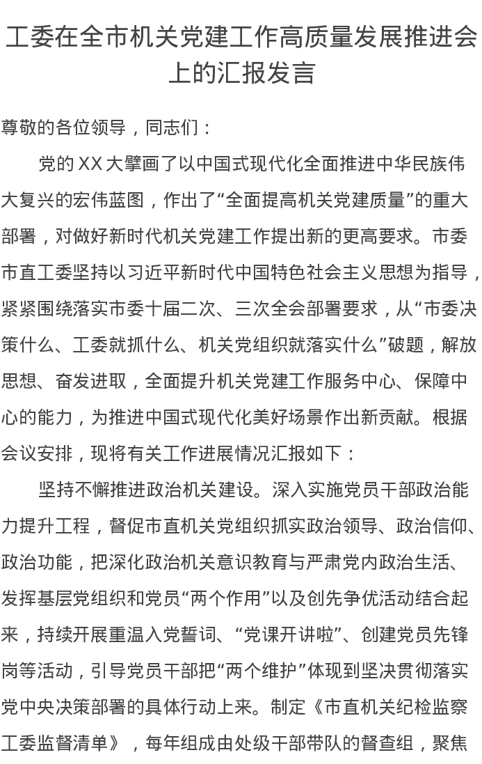 工委在全市机关党建工作高质量发展推进会上的汇报发言