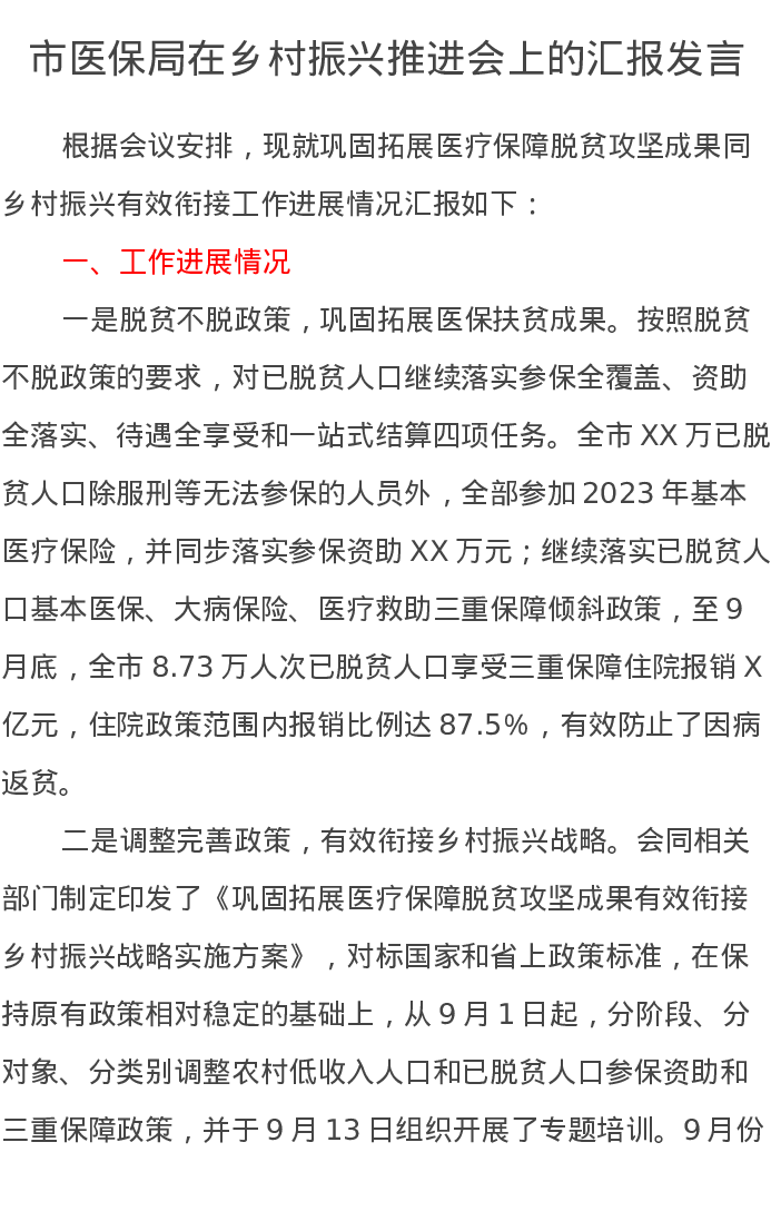 市医保局在乡村振兴推进会上的汇报发言