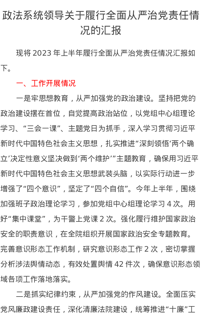 政法系统领导关于履行全面从严治党责任情况的汇报