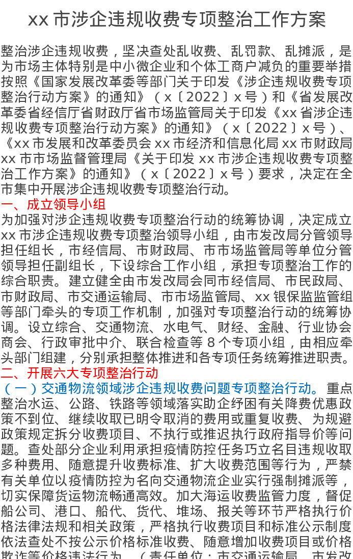 xx市涉企违规收费专项整治工作方案