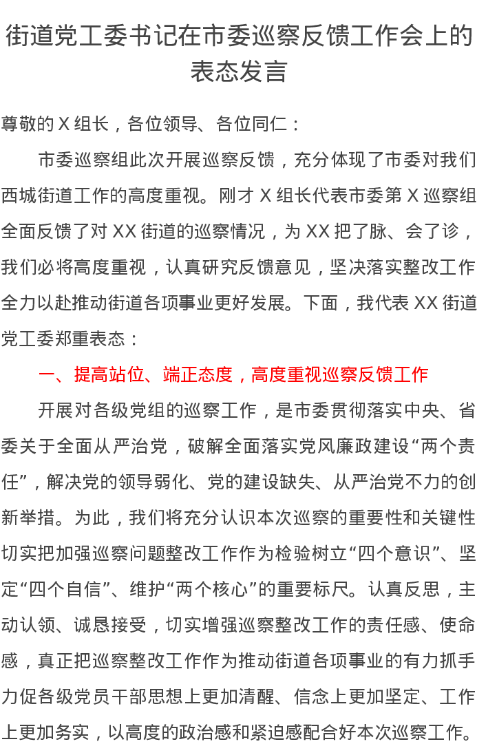 街道党工委书记在市委巡察反馈工作会上的表态发言