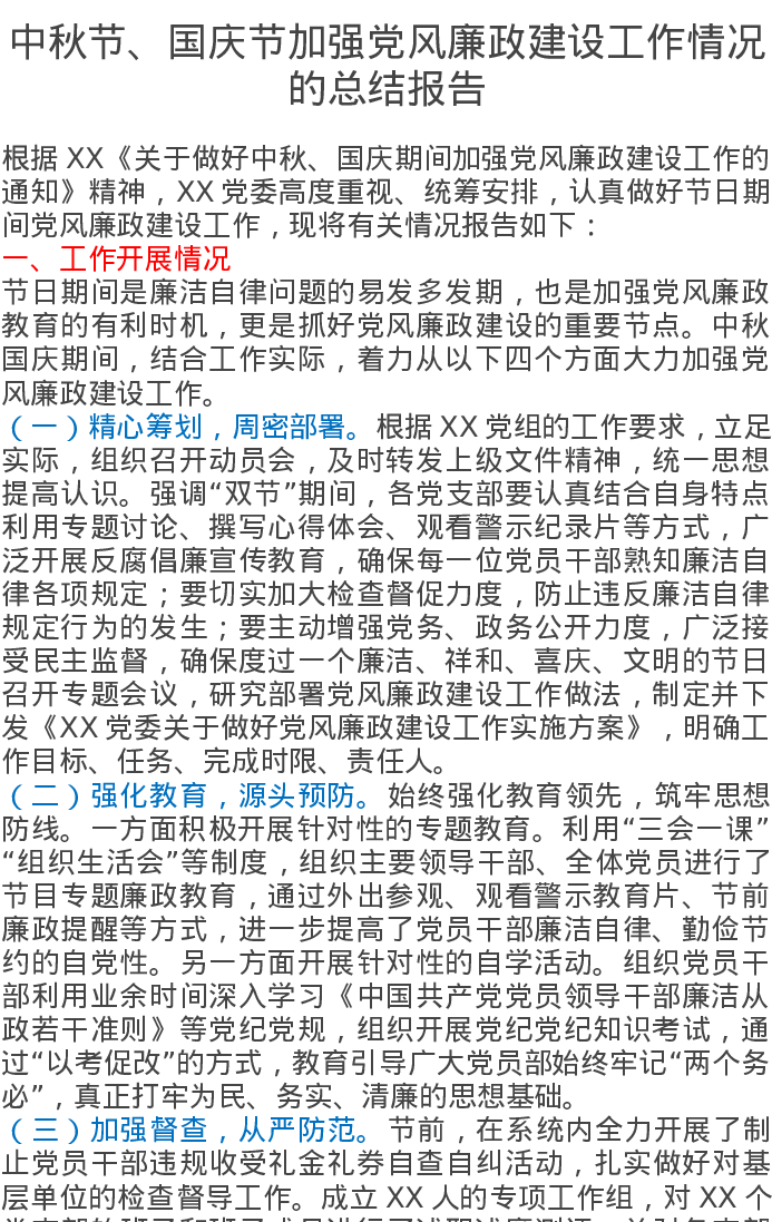 中秋节、国庆节加强党风廉政建设工作情况的总结报告