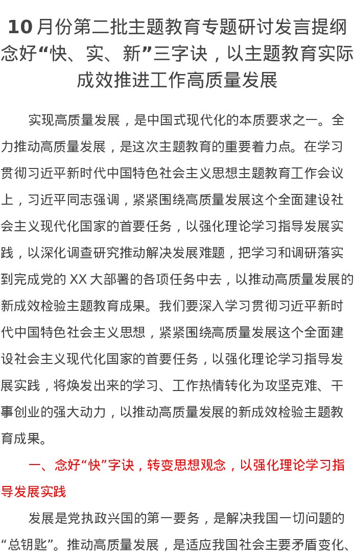 10月份第二批主题教育专题研讨发言提纲:念好“快、实、新”三字诀,以主题教育实际成效推进工作高质量发展(特色社会主义思想)