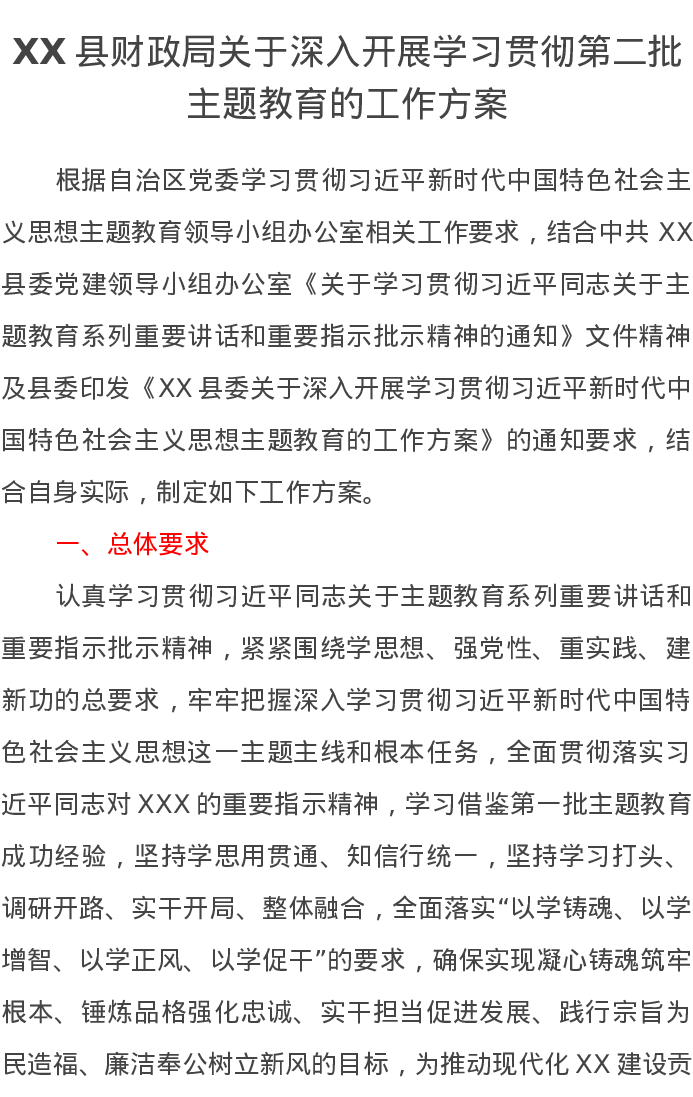 XX县财政局关于深入开展学习贯彻第二批主题教育的工作方案(特色社会主义思想)