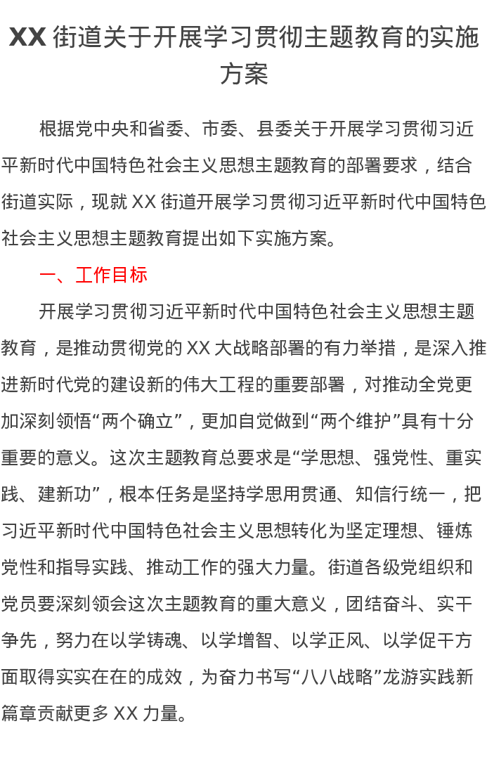XX街道关于开展学习贯彻第二批主题教育的实施方案(特色社会主义思想)