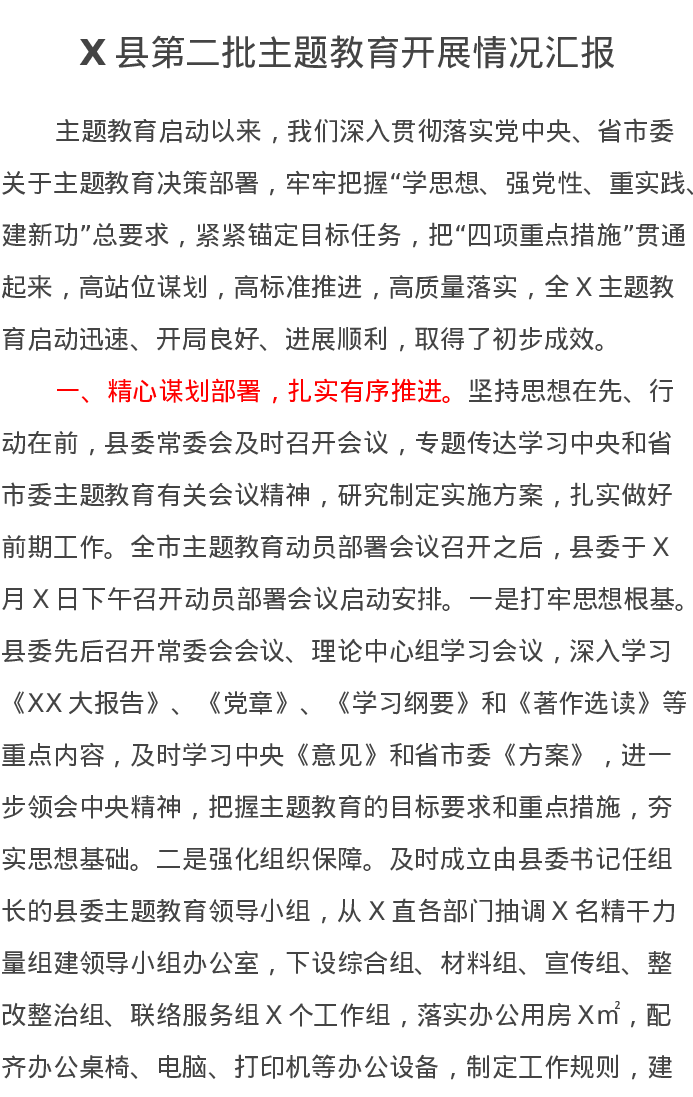X县第二批主题教育开展情况汇报(特色社会主义思想)