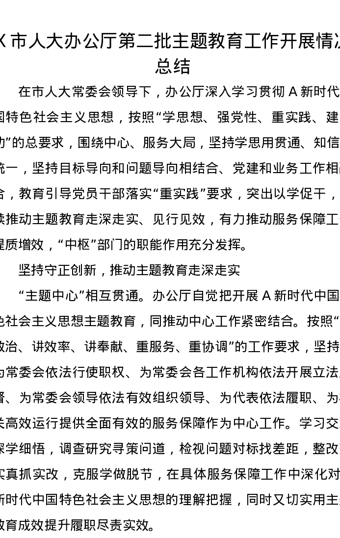X市人大办公厅第二批主题教育工作开展情况总结(特色社会主义思想)
