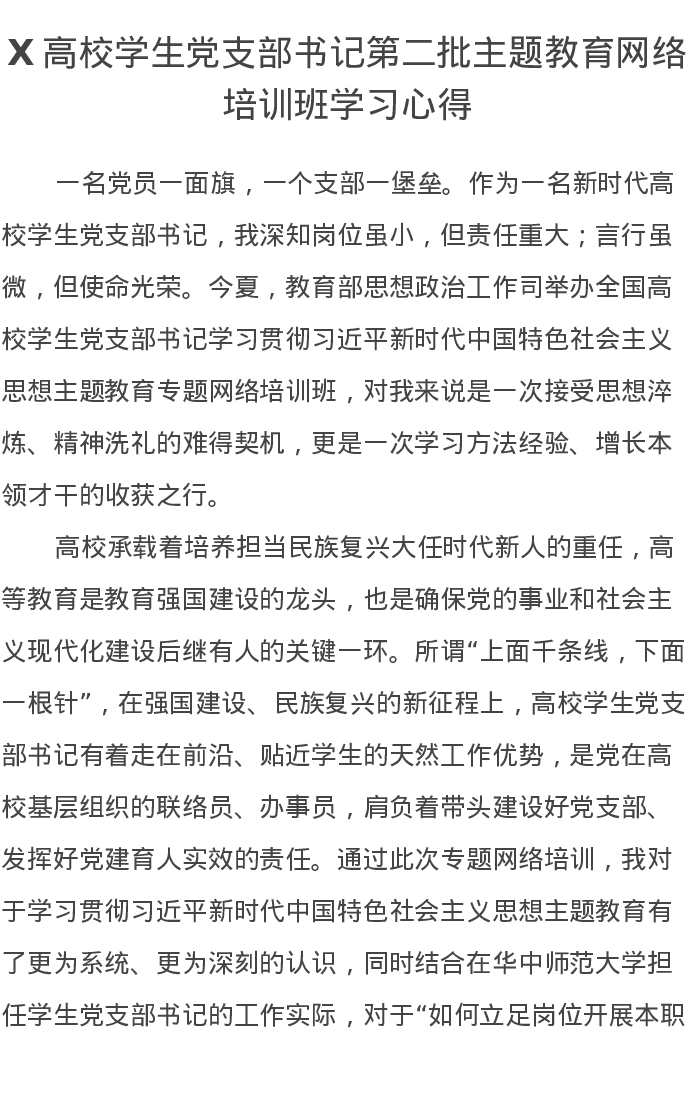 X高校学生党支部书记第二批主题教育网络培训班学习心得(特色社会主义思想)