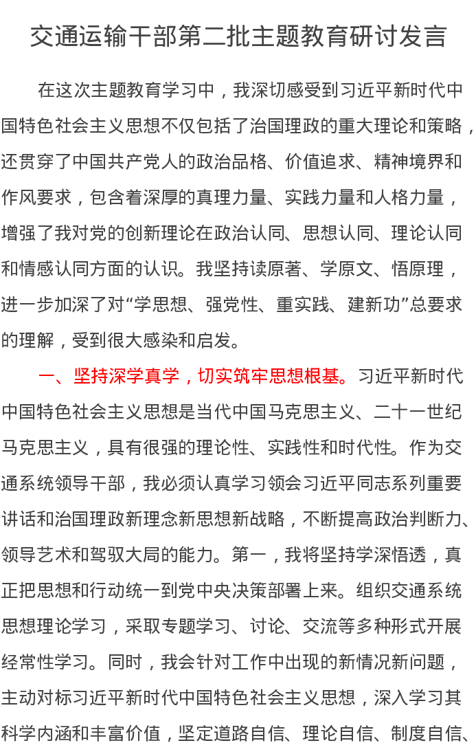 交通运输干部第二批主题教育研讨发言(特色社会主义思想)
