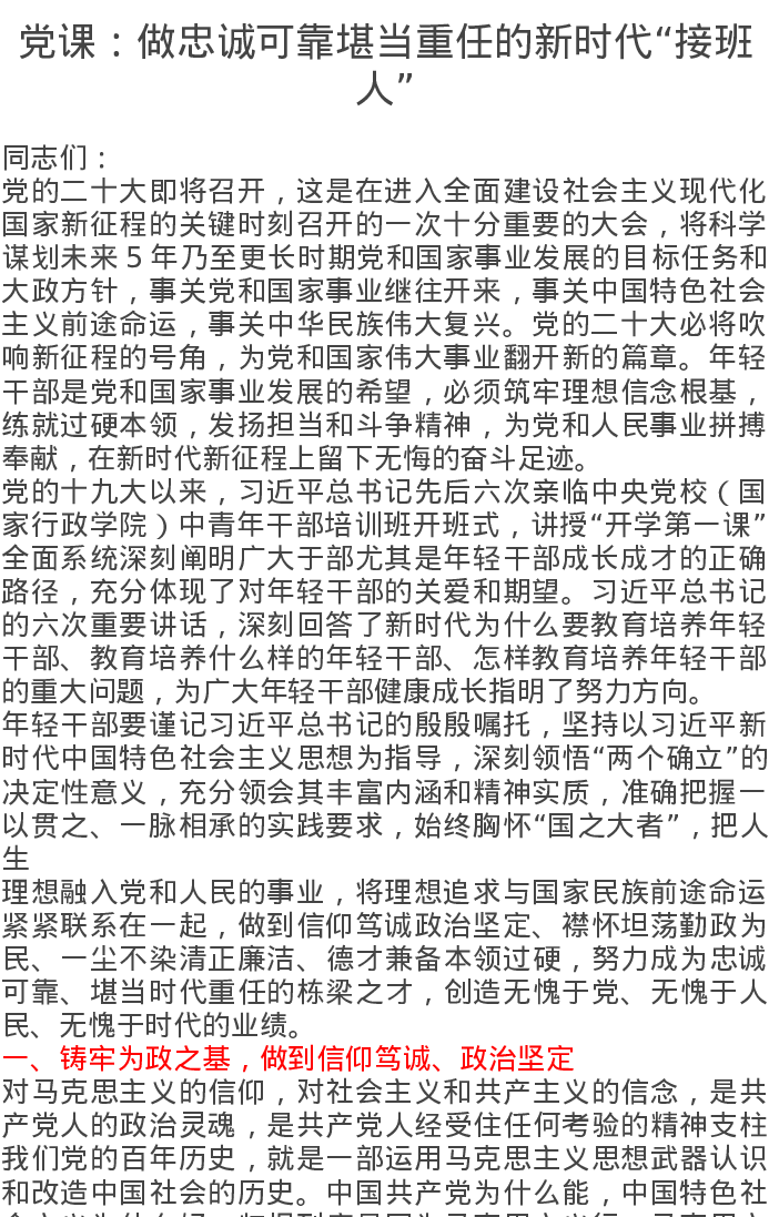 党课讲稿:做忠诚可靠堪当重任的新时代“接班人”