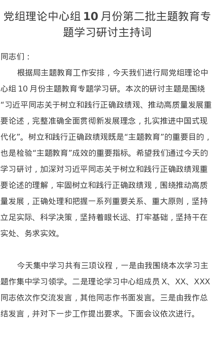党组理论中心组10月份第二批主题教育专题学习研讨主持词(特色社会主义思想)