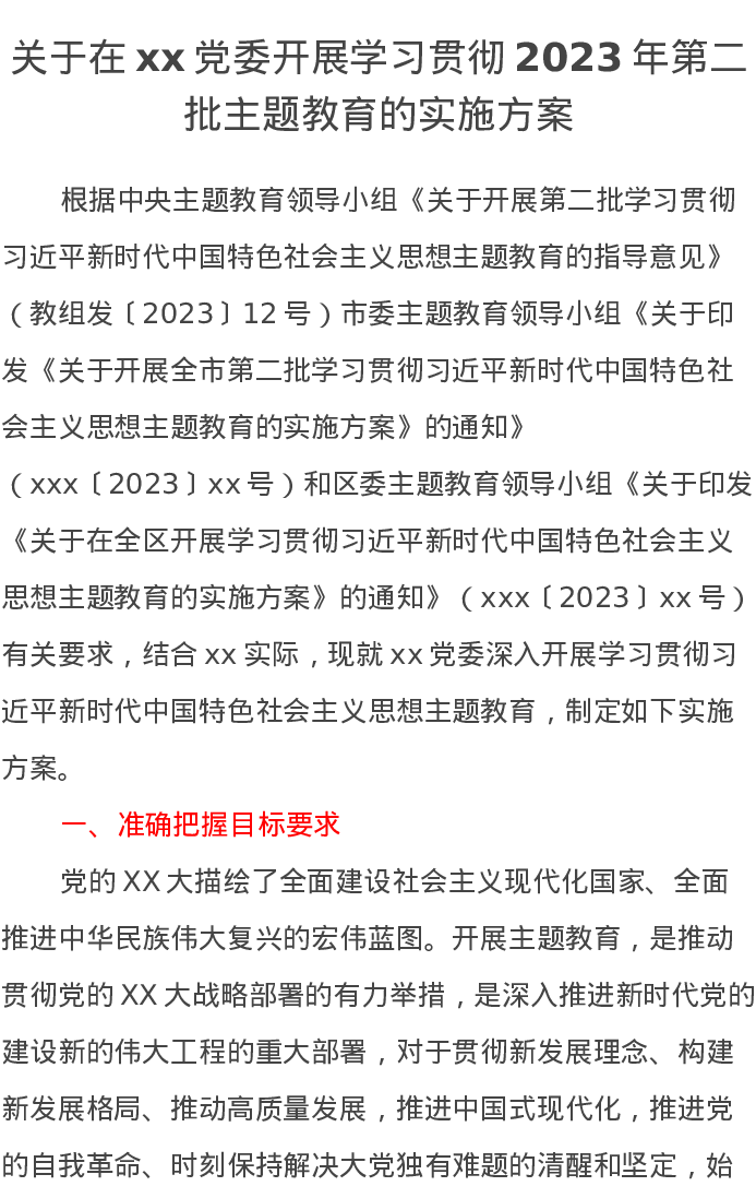 关于在xx党委开展学习贯彻2023年第二批主题教育的实施方案(特色社会主义思想)
