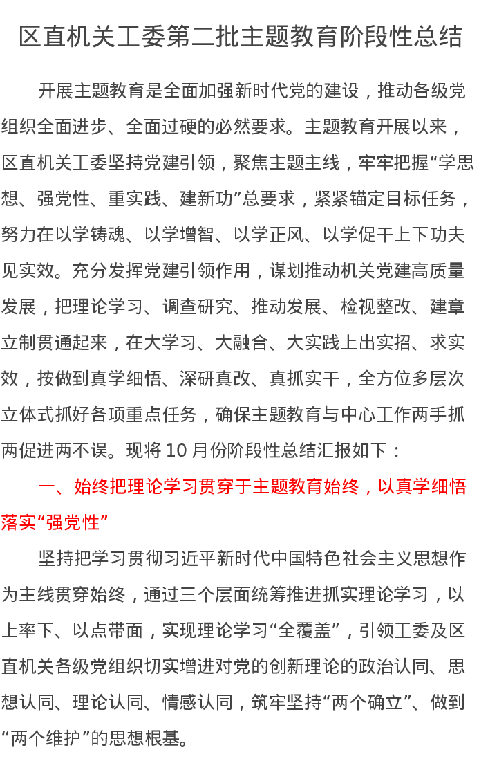 区直机关工委第二批主题教育阶段性总结(特色社会主义思想)
