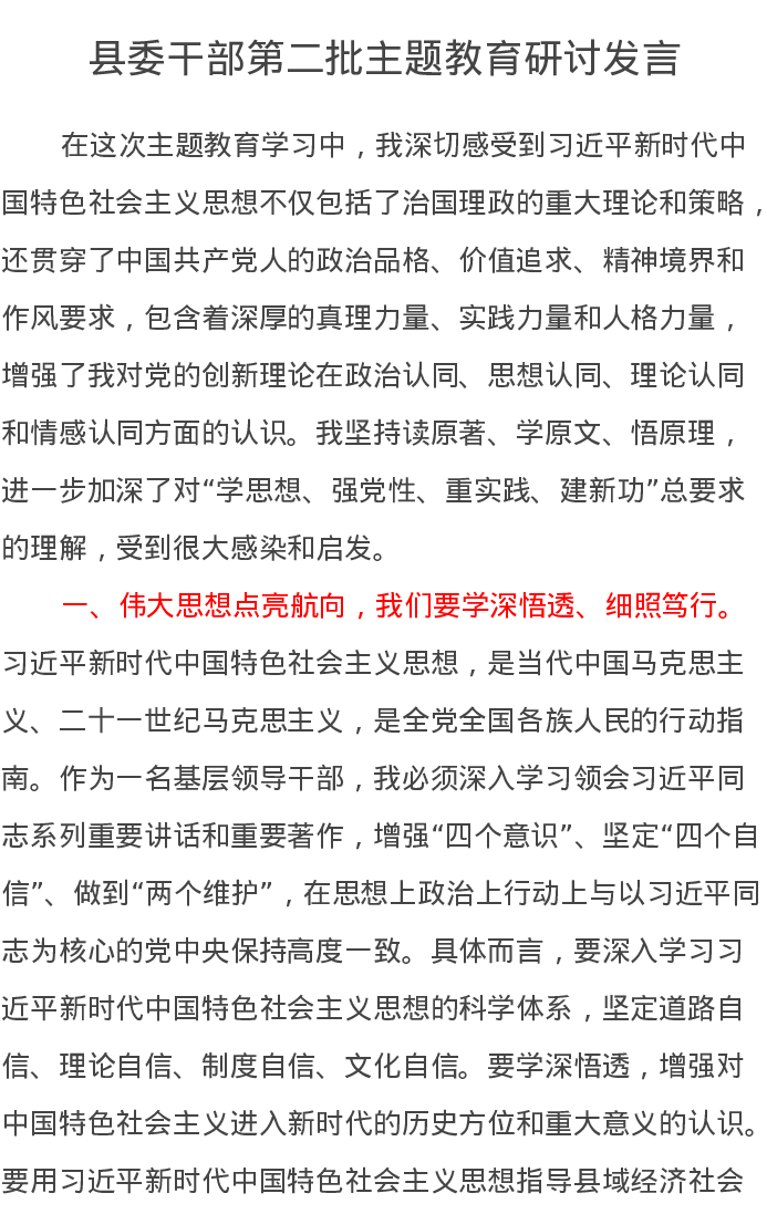 县委干部第二批主题教育研讨发言(特色社会主义思想)