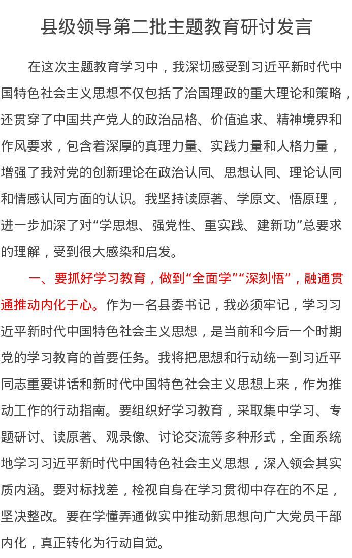 县级领导第二批主题教育研讨发言(特色社会主义思想)