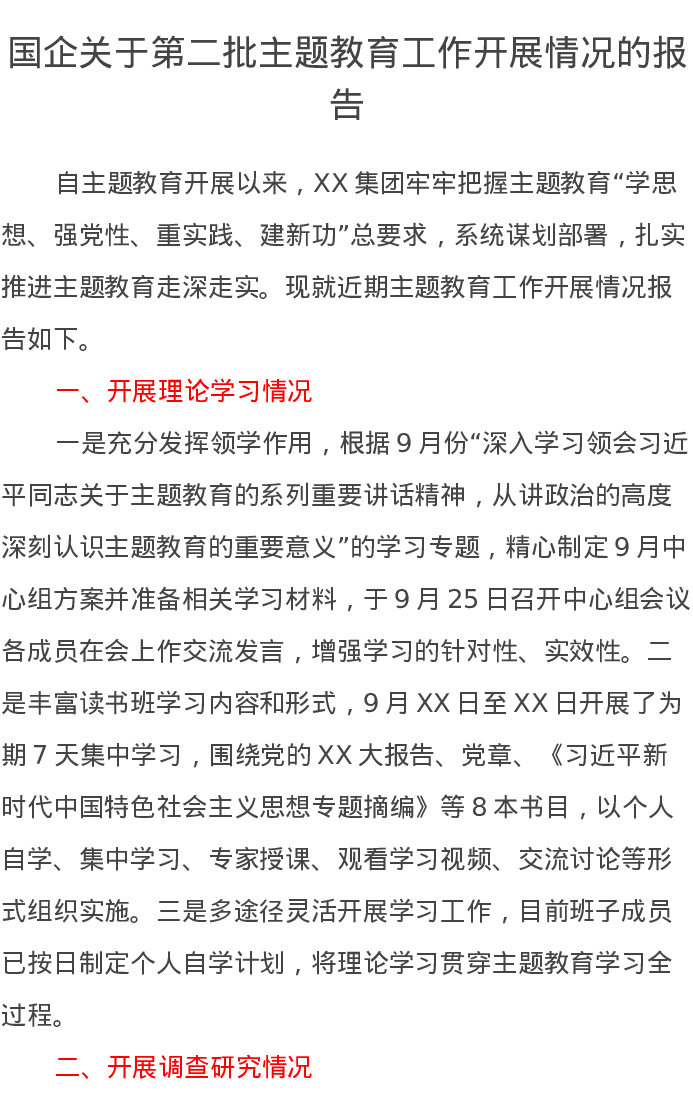 国企关于第二批主题教育工作开展情况的报告(特色社会主义思想)