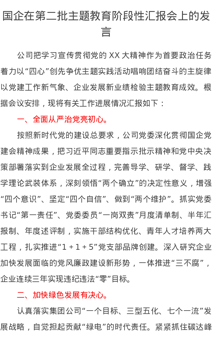 国企在第二批主题教育阶段性汇报会上的发言(特色社会主义思想)