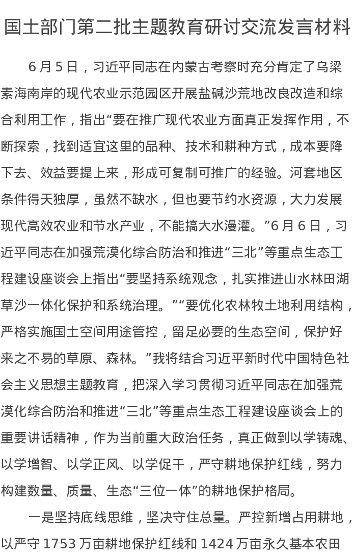 国土部门第二批主题教育研讨交流发言材料5(特色社会主义思想)