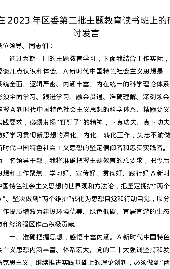 在2023年区委第二批主题教育读书班上的研讨发言(特色社会主义思想)