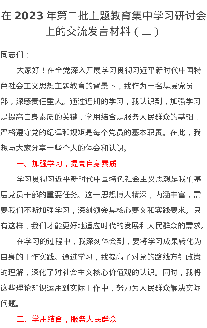 在2023年第二批主题教育集中学习研讨会上的交流发言材料2(特色社会主义思想)
