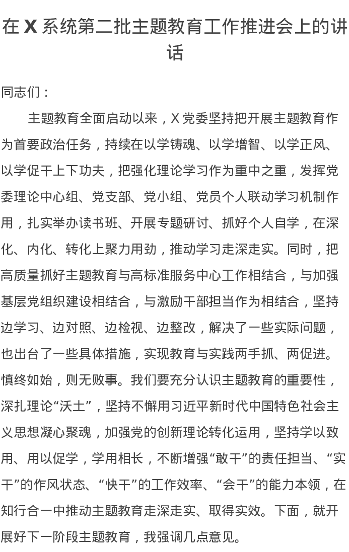 在X系统第二批主题教育工作推进会上的讲话(特色社会主义思想)