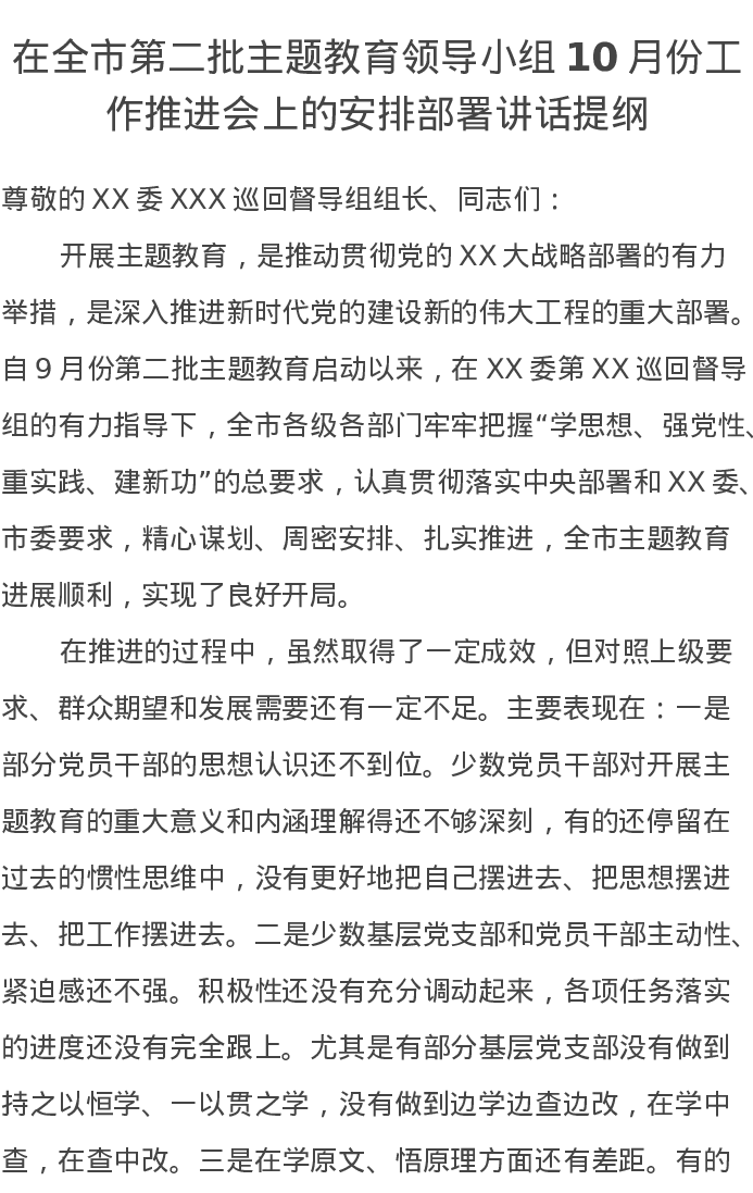 在全市第二批主题教育领导小组10月份工作推进会上的安排部署讲话提纲(特色社会主义思想)