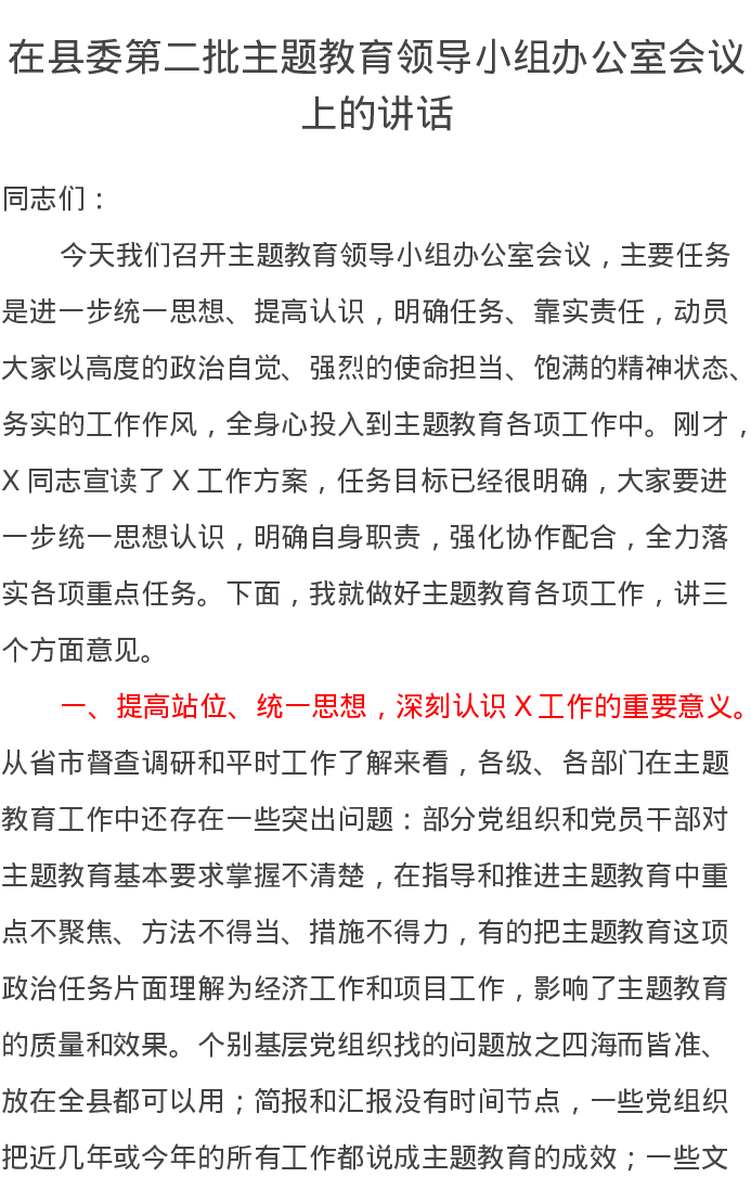 在县委第二批主题教育领导小组办公室会议上的讲话(特色社会主义思想)