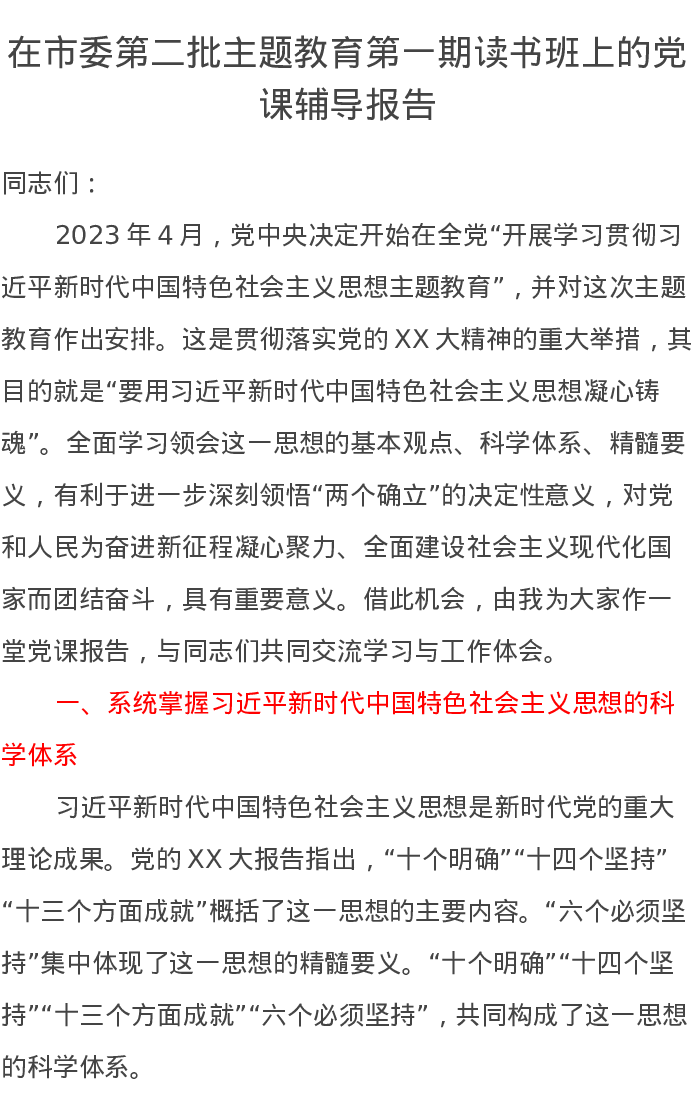 在市委第二批主题教育第一期读书班上的党课辅导报告(特色社会主义思想)