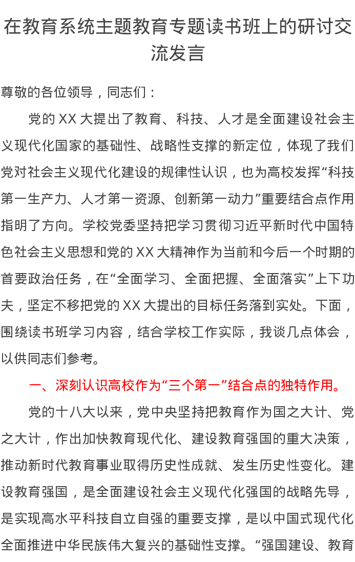 在教育系统第二批主题教育专题读书班上的研讨交流发言(特色社会主义思想)