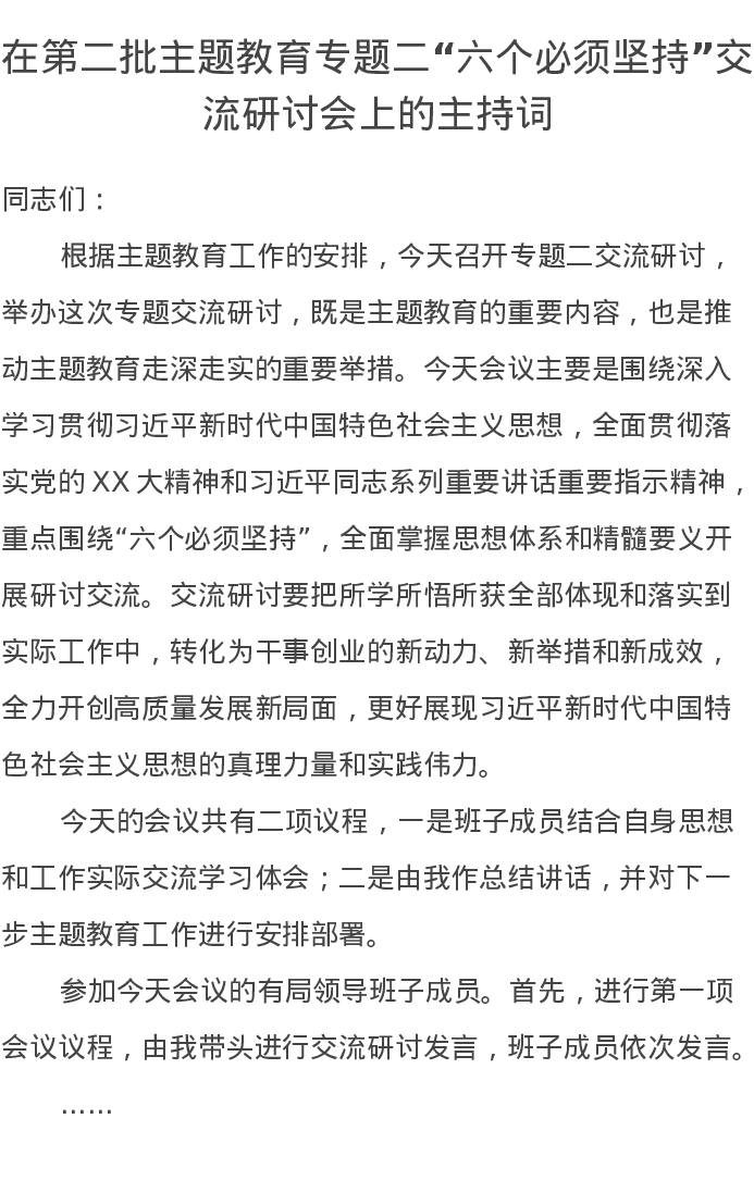 在第二批主题教育专题二“六个必须坚持”交流研讨会上的主持词(特色社会主义思想)