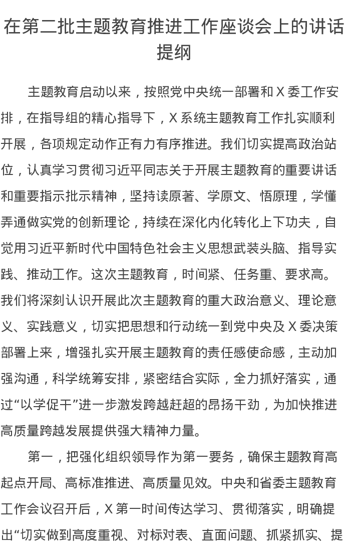 在第二批主题教育推进工作座谈会上的讲话提纲(特色社会主义思想)