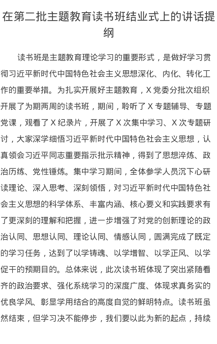 在第二批主题教育读书班结业式上的讲话提纲(特色社会主义思想)