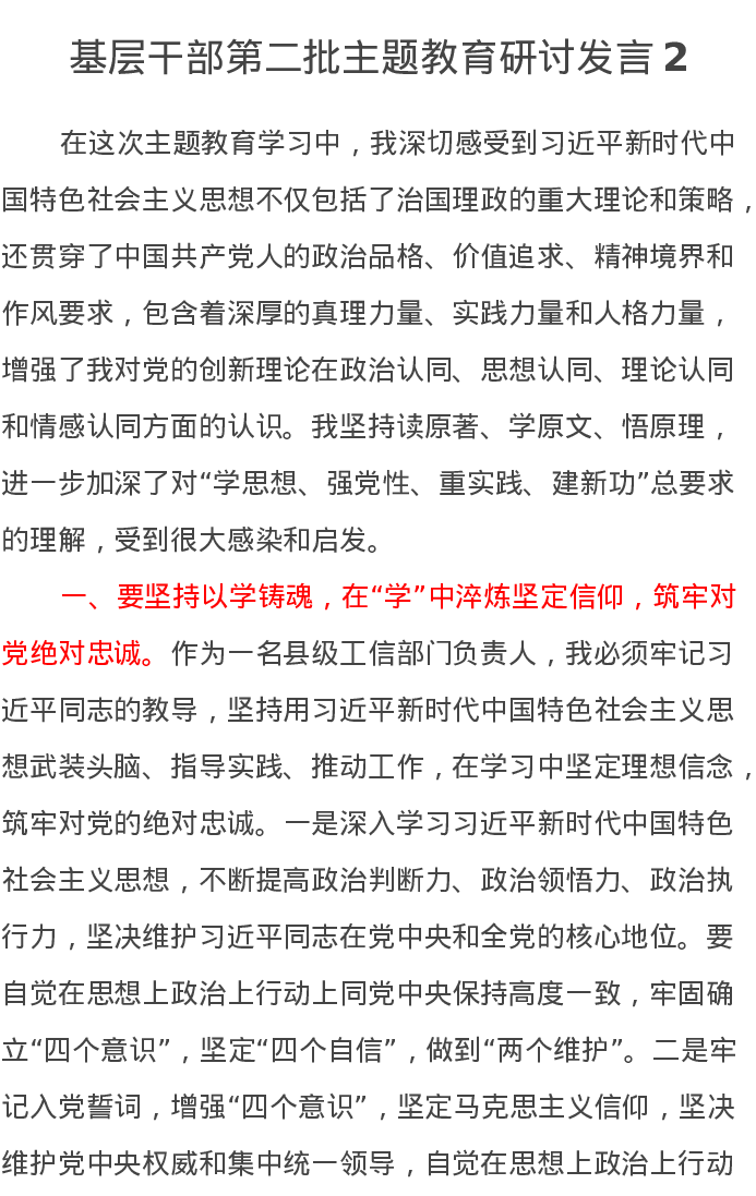 基层干部第二批主题教育研讨发言2(特色社会主义思想)