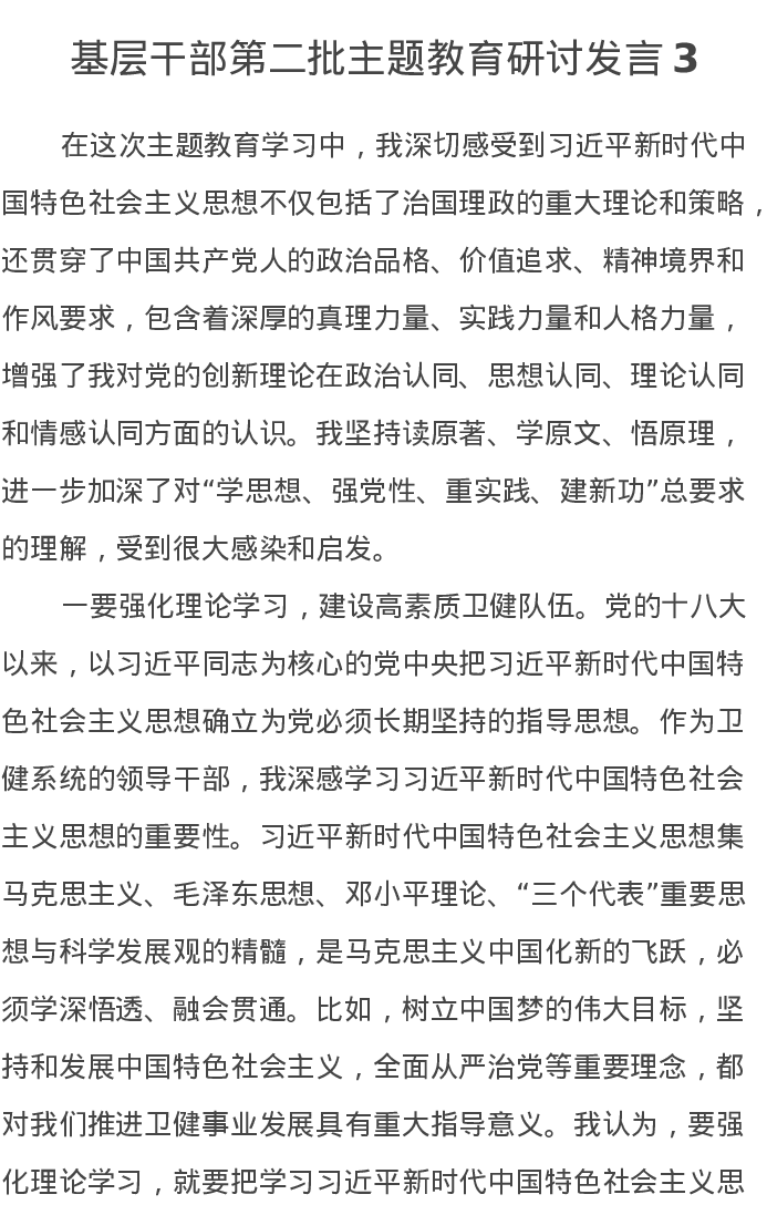 基层干部第二批主题教育研讨发言4(特色社会主义思想)